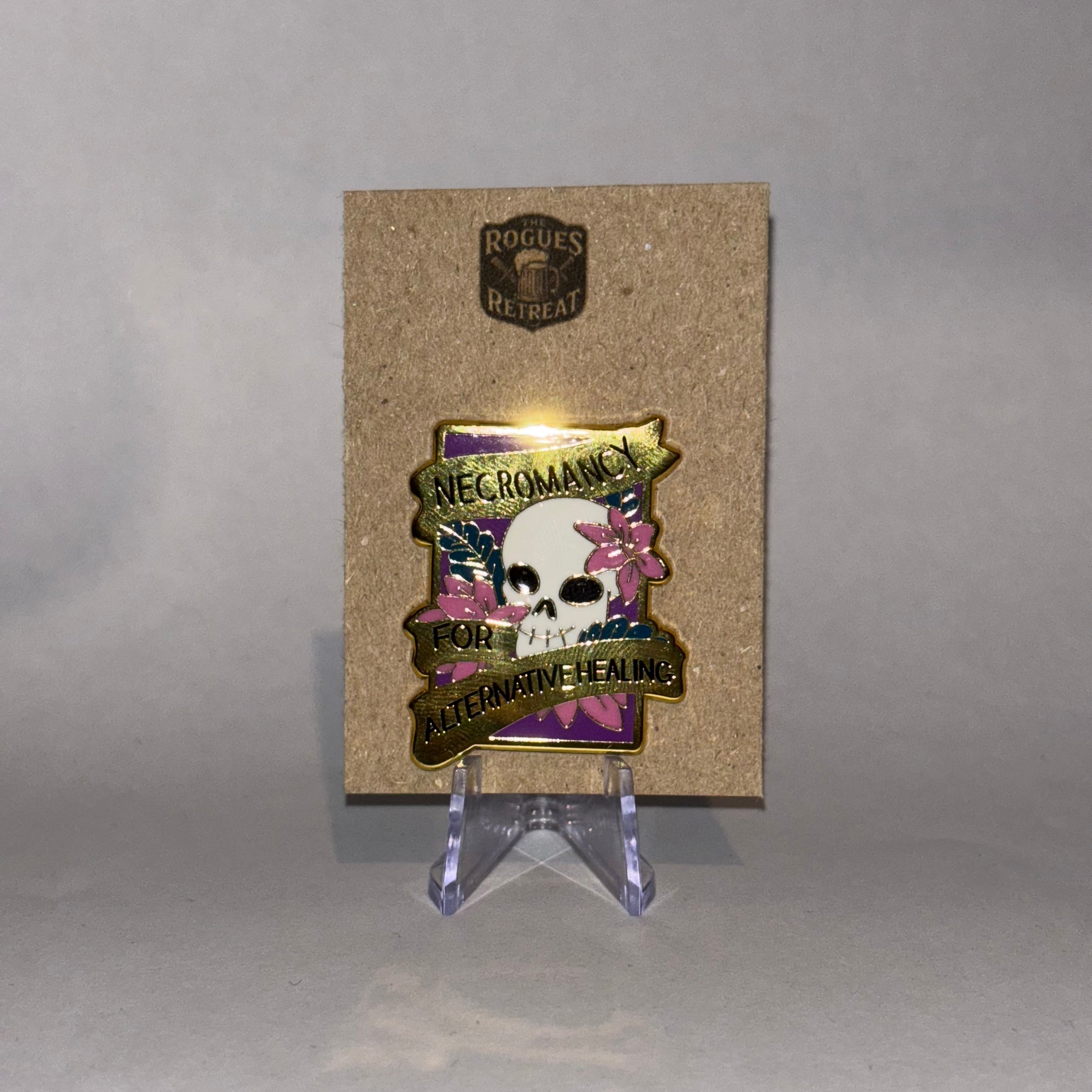 Embrace the dark arts of self-care with this wickedly witty golden pin. Perfect for tabletop adventurers who appreciate a bit of morbid humour, this enamel beauty celebrates the unconventional healing methods that keep your party alive even if it requires a little necromantic intervention.