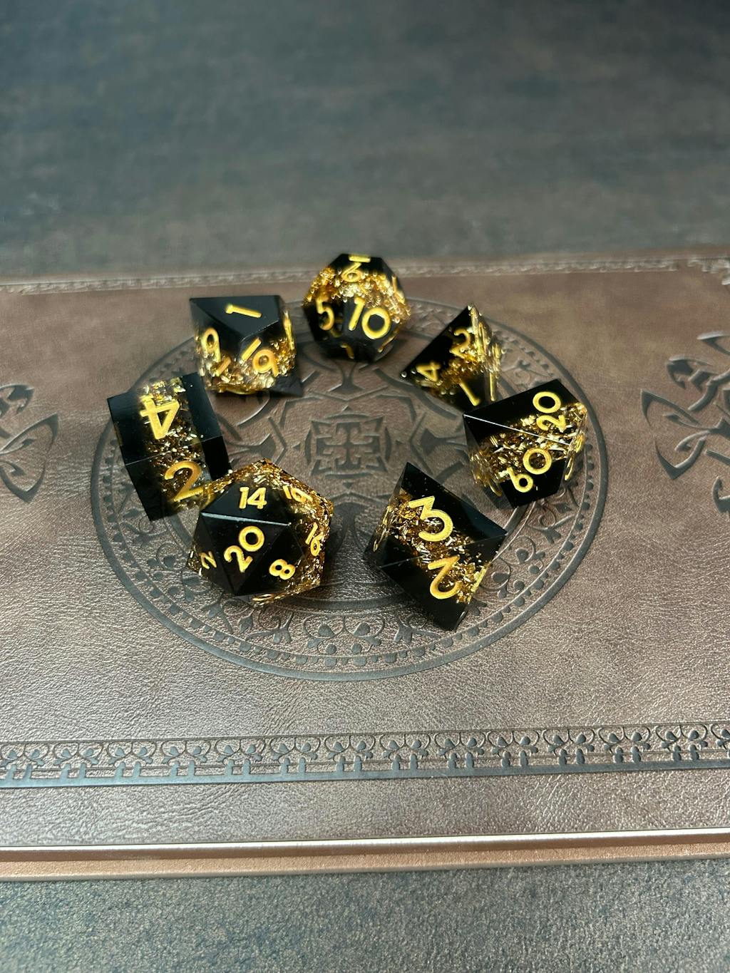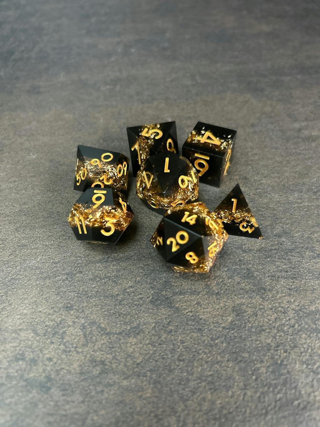 Roll with style! These striking sharp dice feature a sleek black finish with a gorgeous golden core that runs through the centre, creating a stunning visual contrast. Whether you're a seasoned adventurer or just starting your gaming journey, these dice are sure to turn heads at the table.